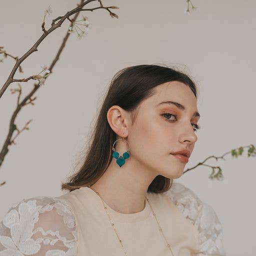 These handcrafted hoop earrings feature lightweight leaf charms in a refined, linked design with teal patina finish. Dimensions: 2.375" L x 1.25" W All of Matr Boomie's collection is handmade, fair trade and sustainable.