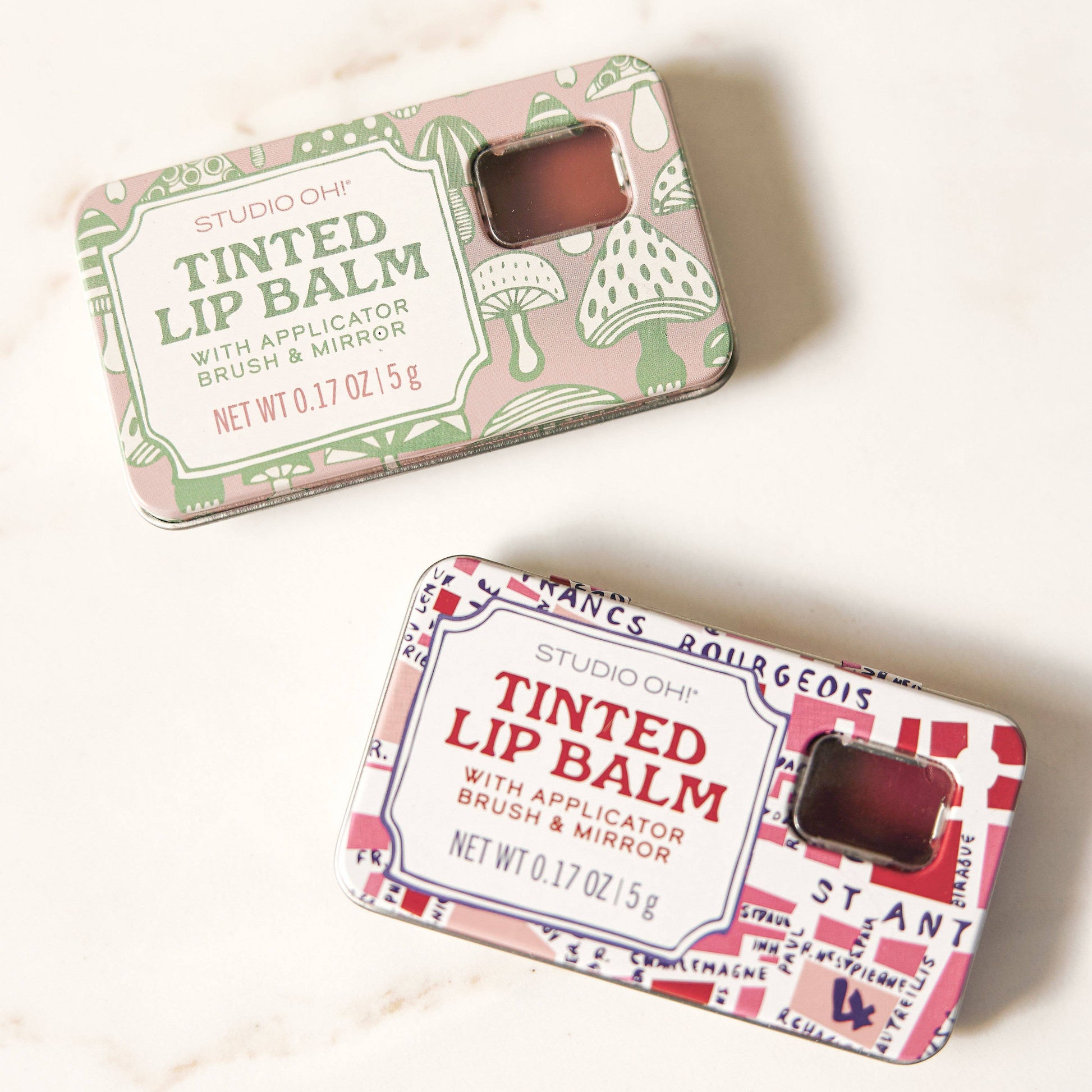 Say goodbye to messy glosses and cakey lipstick—Tinted Lip Balms from Studio Oh! are smooth and sheer. Each portable kit features delightful artwork and includes an applicator brush and mirror, allowing you to apply and touch up anywhere you go. Our Tinted Lip Balm comes in lovely shades and gives lips the perfect hint of color—from subtle neutrals to playful pinks.