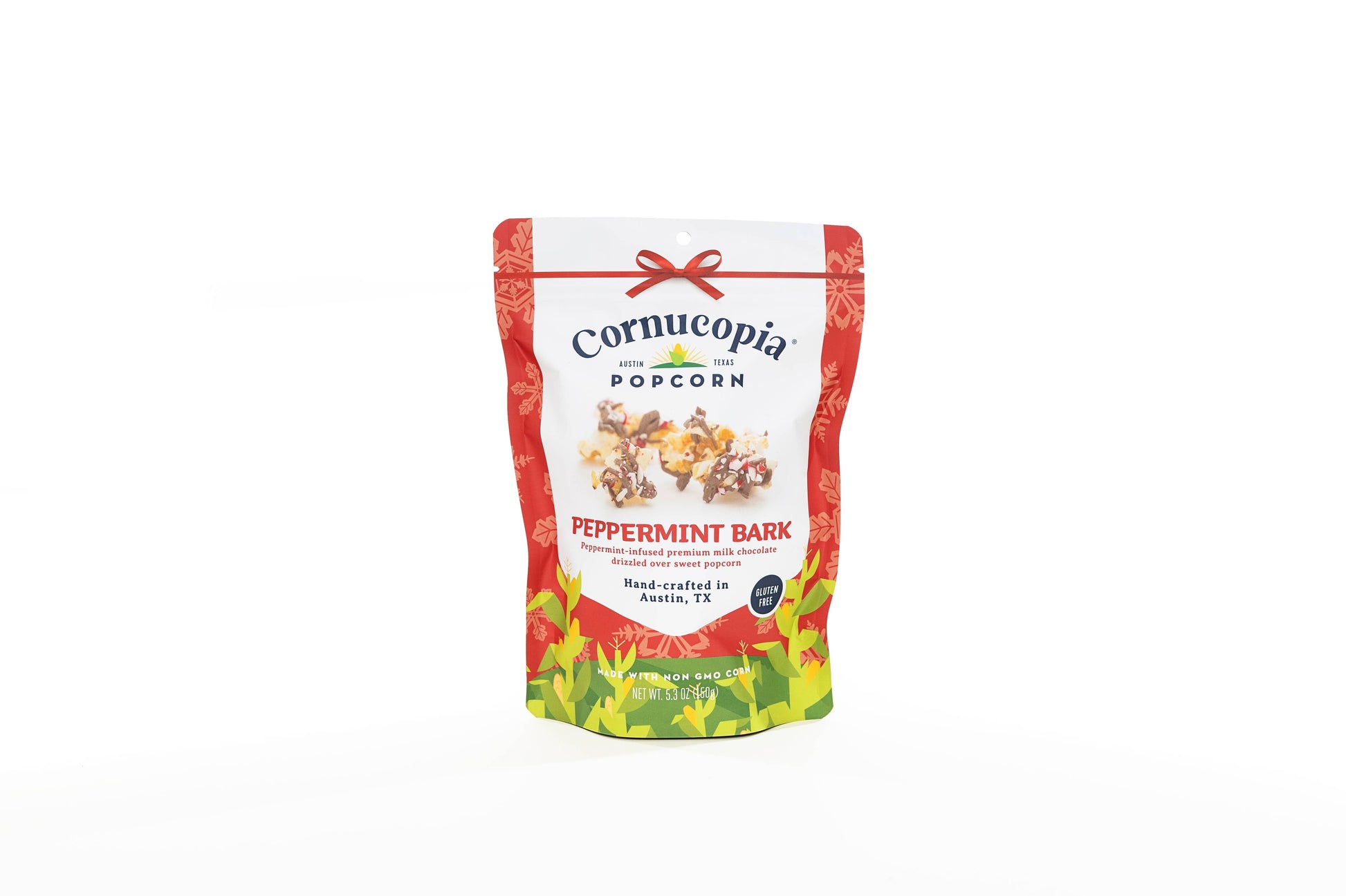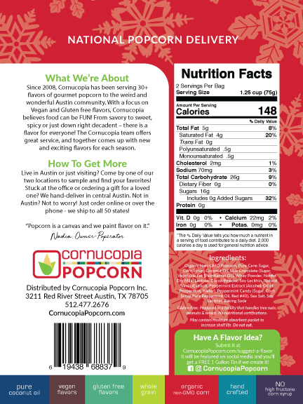 This festive gourmet treat starts with sweet candied popcorn, then gets drizzled with rich milk chocolate and topped with crushed peppermint candy for the perfect holiday crunch. Each bag includes 3 full cups of indulgent, gluten-free goodness with a 6–8 month shelf life.