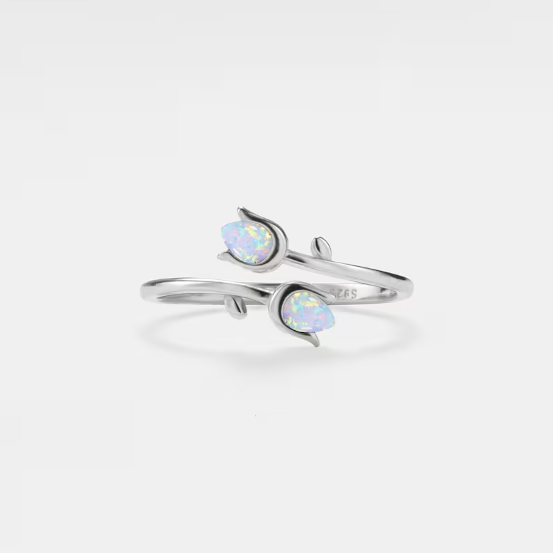 Dainty Opal Tulip Flower Bypass Ring in 925 Sterling Silver