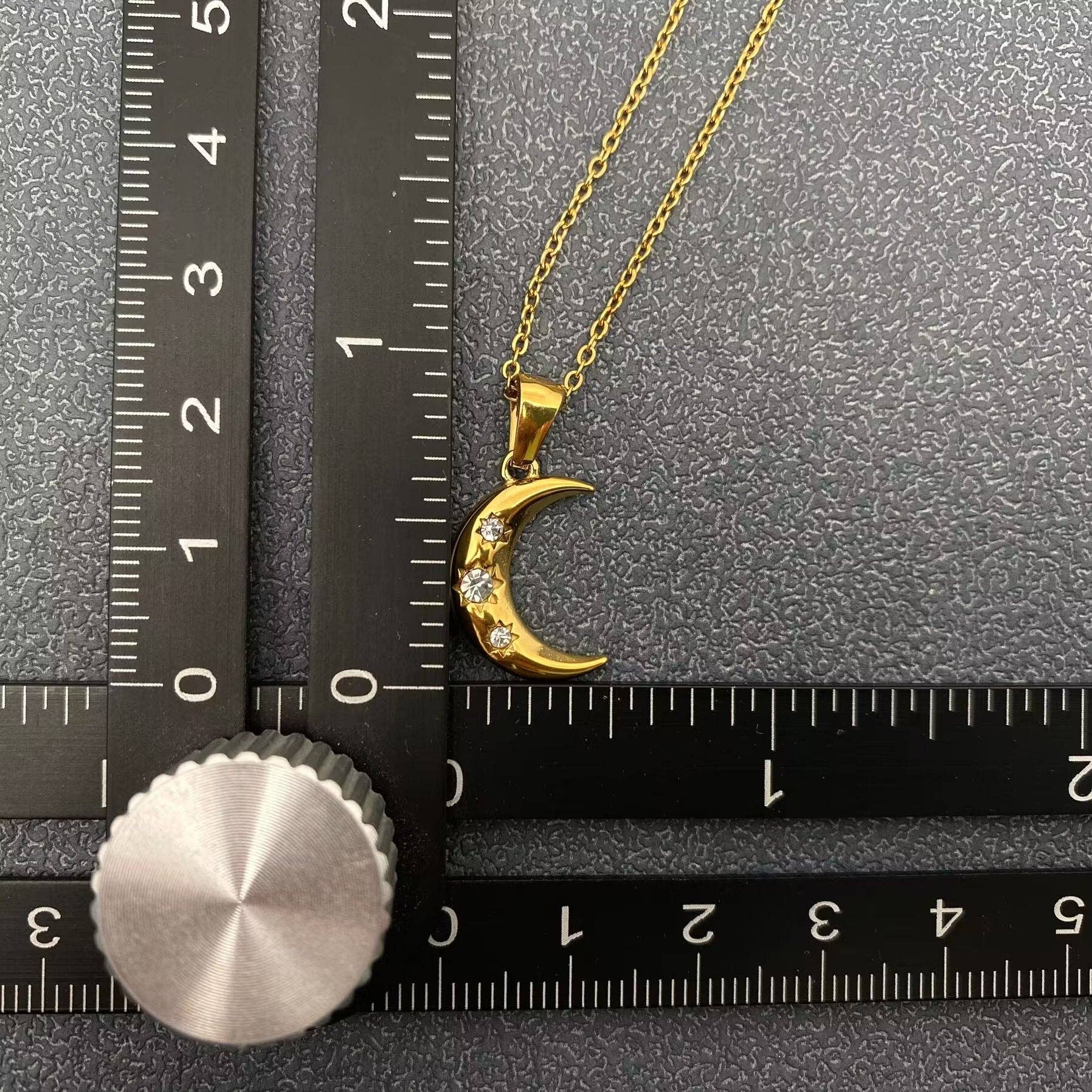 Shine like the night sky with this gold-plated stainless steel moon necklace — a delicate crescent sprinkled with inlaid cubic zirconia for just the right amount of sparkle. Crafted from 316L stainless steel and finished in 18K gold, it’s designed to stay bright and never tarnish. The pendant measures about 0.51" × 0.87", and hangs from a 16.1" chain with a 2.4" extender, perfect for layering or wearing solo.