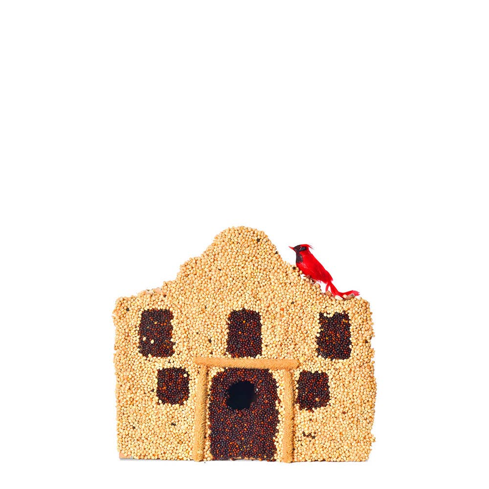 The alamo! The cradle of Texas liberty. Founded in 1718 in San Antonio, Texas. This house commemorates the Mission San Antonio de Valero, the site of the famous battle of the Texas Revolution where Commander William Travis, Colonel James Bowie, Congressman Davy Crockett, and 180 odd troops fell to the Mexican dictator Santa Anna. Delicious and delectable premium birdseed and nuts coat this durable wooden birdhouse. Once the seed is consumed the birds may nest in this house for many seasons to come. What to expect: the seed may attract; sparrows, doves, chickadees, cardinals, titmice, finches, jays, and numerous other seed-eating birds. Wrens, chickadees, titmice, woodpeckers, sparrows, and other birds may use the house for nesting once the seed is gone. Instructions: for feeding hang the house from a tree limb or hanger near your favorite window so that you may enjoy the birds as they come to feed. Packaging information: clear polybag closed Compatible feeders: 808.