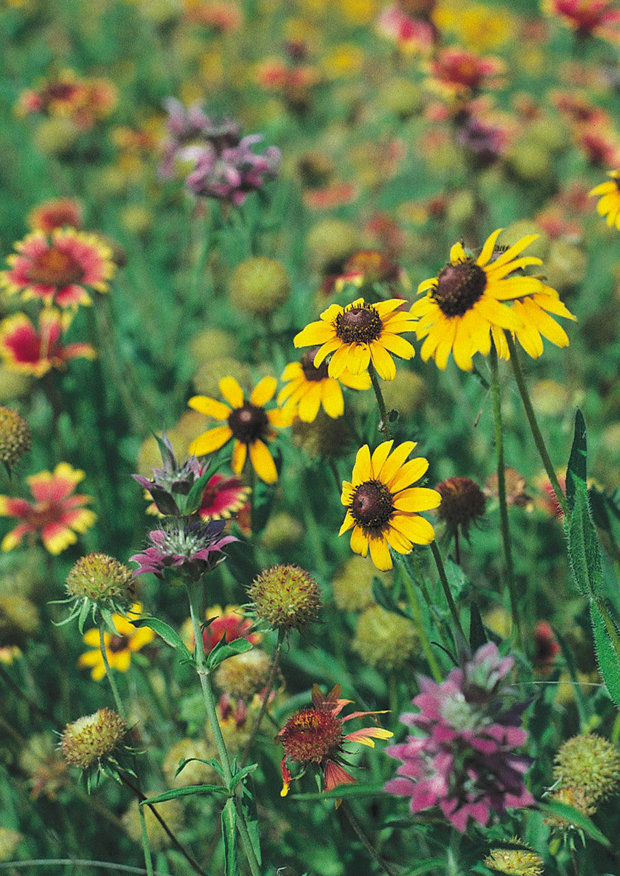The Native Texas Mix is full of iconic wildflowers that every native Texan has a fond memory of. Its mix of short and tall plants creates a beautiful, free-flowing prairie sea of yellows and deep reds, Indian Blanket and Plains Coreopsis, dancing together with the soft purples of Bluebonnets and Lemon Mint. Once established, this mix shares its blooms throughout the growing season. Bluebonnets start the show, followed by Plains Coreopsis and Lemon Mint. Hardy Indian Blanket and Mexican Hat show off their colors through the summer, and a flourish of Prairie Coneflower and Black-Eyed Susan finish the season.
