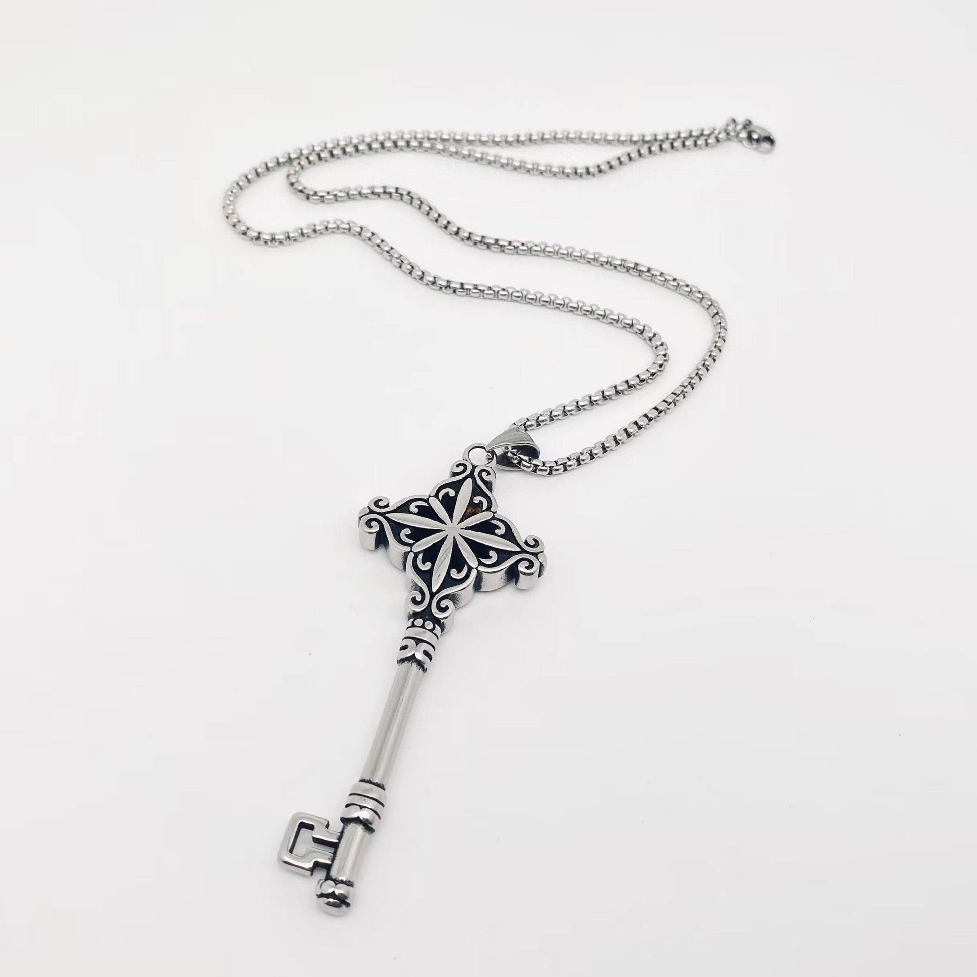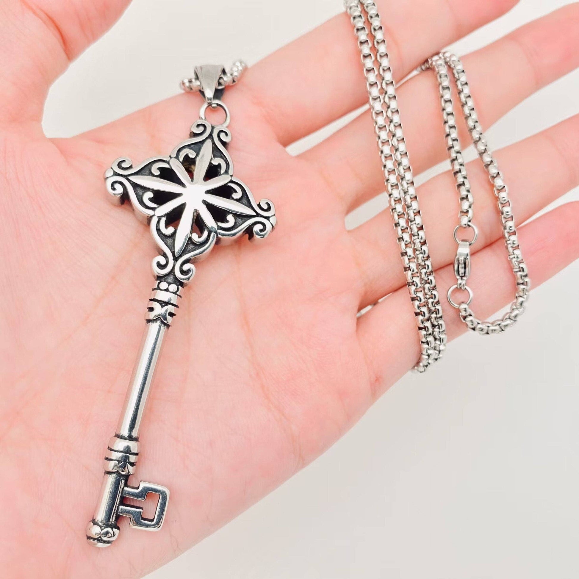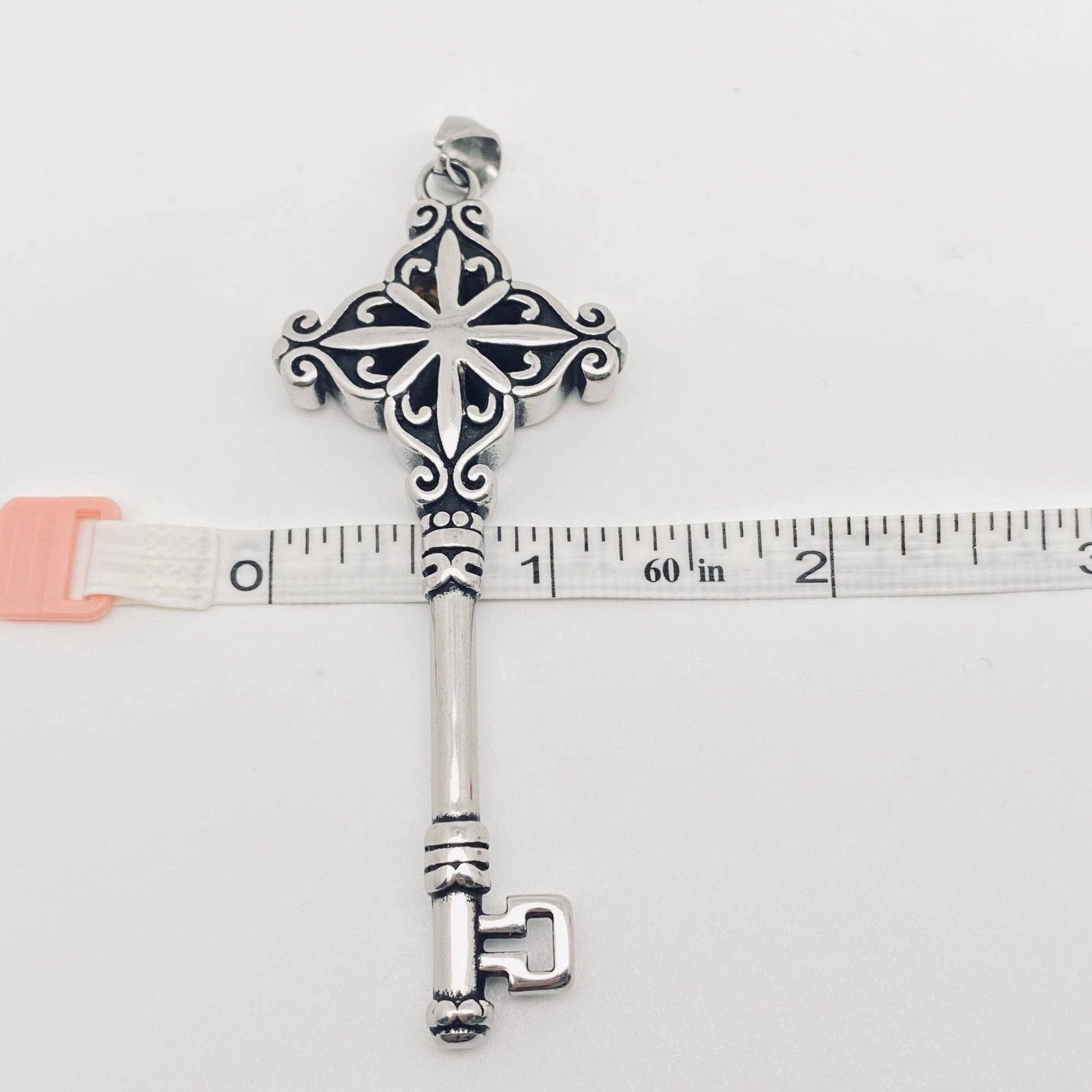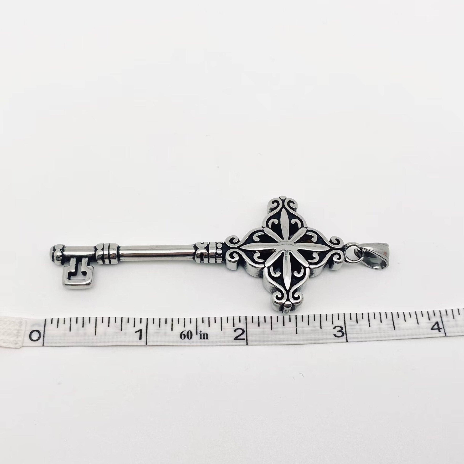 Stainless steel vintage skeleton key pendant on a long 26" stainless steel square chain.