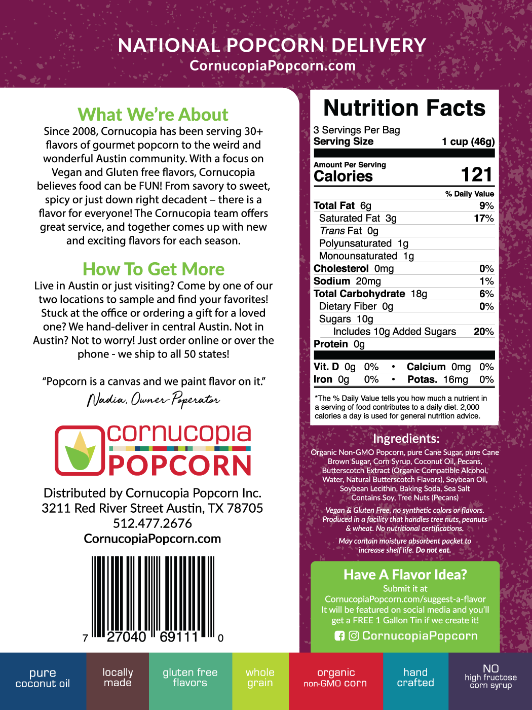 Rich, buttery, candied popcorn meets salty Texas pecans.